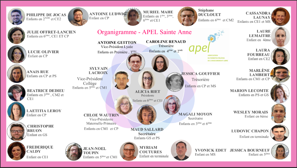 Le conseil d’administration de l’Apel Sainte-Anne est avant tout une équipe de parents bénévoles qui participe concrètement à la vie et à l’animation de l’établissement.